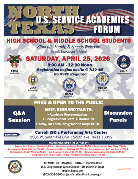 Each November, Congressman Gooden’s office conducts interviews for nominations to four of the five U.S. Service Academies: U.S. Military Academy (USMA), West Point, N.Y.; the U.S. Naval Academy (USNA), Annapolis, Md.; the U.S. Air Force Academy (USAFA), Colorado Springs, Colo.; and the U.S. Merchant Marine Academy (USMMA), Kings Point, N.Y. The fifth service academy, the U.S. Coast Guard Academy (USCGA), New London, Conn., does not require a congressional nomination for appointment.